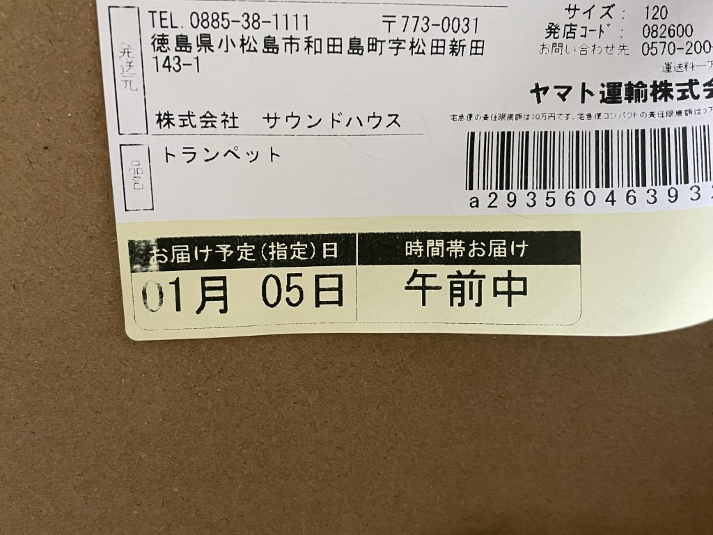 年末に注文、お正月に届くと客人たちでややこしいので年明けの到着指定にしたものが到着しました。荷物のラベルには「トランペット」とありますが、トランペットではございません。中身はカラ。トランペットケースです。