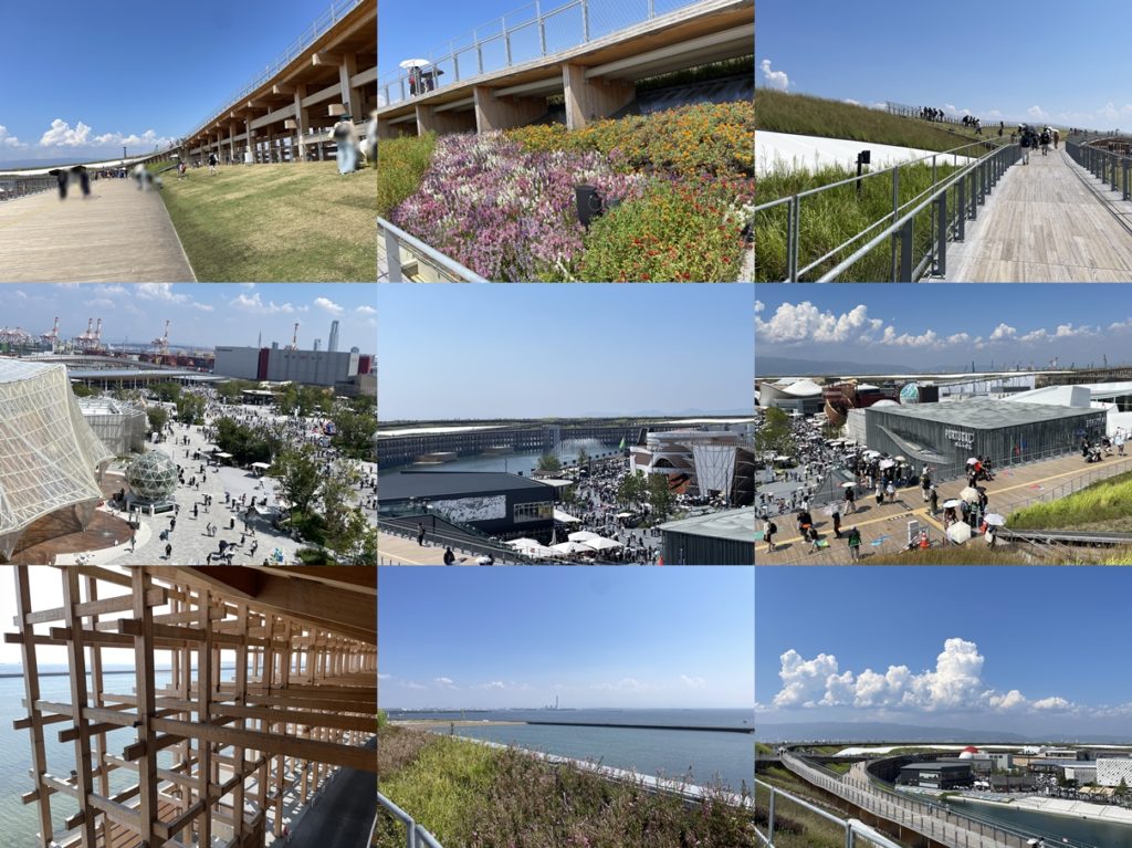 当初の予定通り大屋根リングに上がる。大屋根リングは2階建て。広々として1周回れる2階と部分的に作られた3階。花も植えられていていい感じ。外を見ると海が見える。内側を見るとパビリオン群が見える。