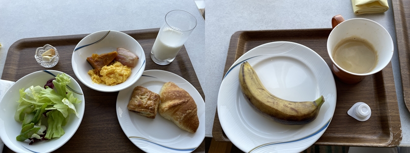 今日はもう下船の日。朝は6時半から食事可能だったので早めに食べる。昨日日本食のレストランに行って大失敗だったので、今日は洋食レストランへ。私にはこちらが大正解でした。バイキングで最初に撮ったものと後から追加したもの。バイキングのバナナは丸々 1本置いてある。カットしてほしい。