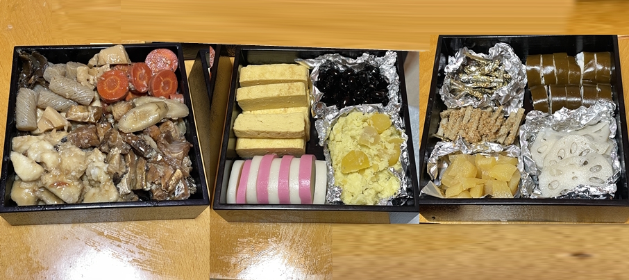 棒鱈の入ったお煮しめ、きんとん、叩き牛蒡、酢蓮が自作。後は出来合いを詰めています。