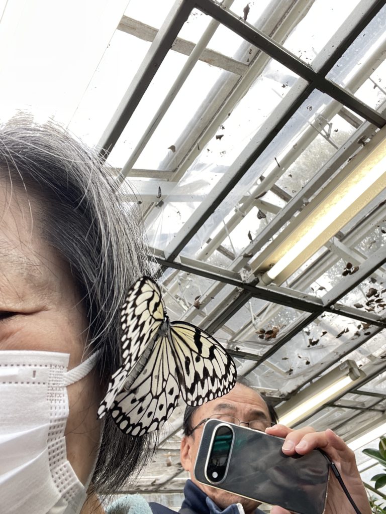 蝶の家で蝶に好かれてしまい、髪留めのようになっていました。柑橘類のにおいが好きで寄ってくるそうですが、椿油も好きなんだろうか? 私の髪、柑橘系のにおいはしないと思うけれど、椿油のにおいならするかもしれません。これはタテハチョウ科のオオゴマダラ。他にタテハチョウ科のリュウキュウアサギマダラとアゲハチョウ科のシロオビアゲハがいます。