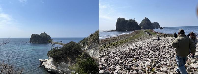 1番行きたかったのは、天窓洞。堂ヶ島から遊覧船で行くのですが、またもや欠航でした。天気は良かったけれど、風があり、駄目だったようです。でも、ラッキーなことに今日訪れた時間はちょうどトンボロ現象の起こる時間だったのです。