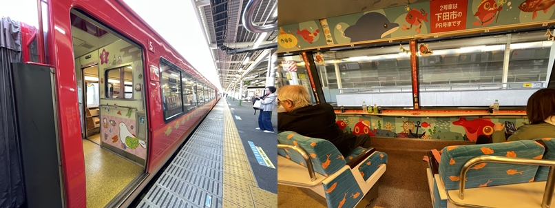 朝8時に出発して熱海経由下田へ。もともとはもっとゆっくり9時ごろに出発するつもりだったのですが、朝早く目が覚めてしまったので予定より早く出ました。そしてたまたま熱海から下田まで乗った電車が「キンメ電車」。普通列車で、ICOCAで乗れるのです。調べて乗ったわけではなくて、たまたま来たのがこの電車。ラッキーでした。