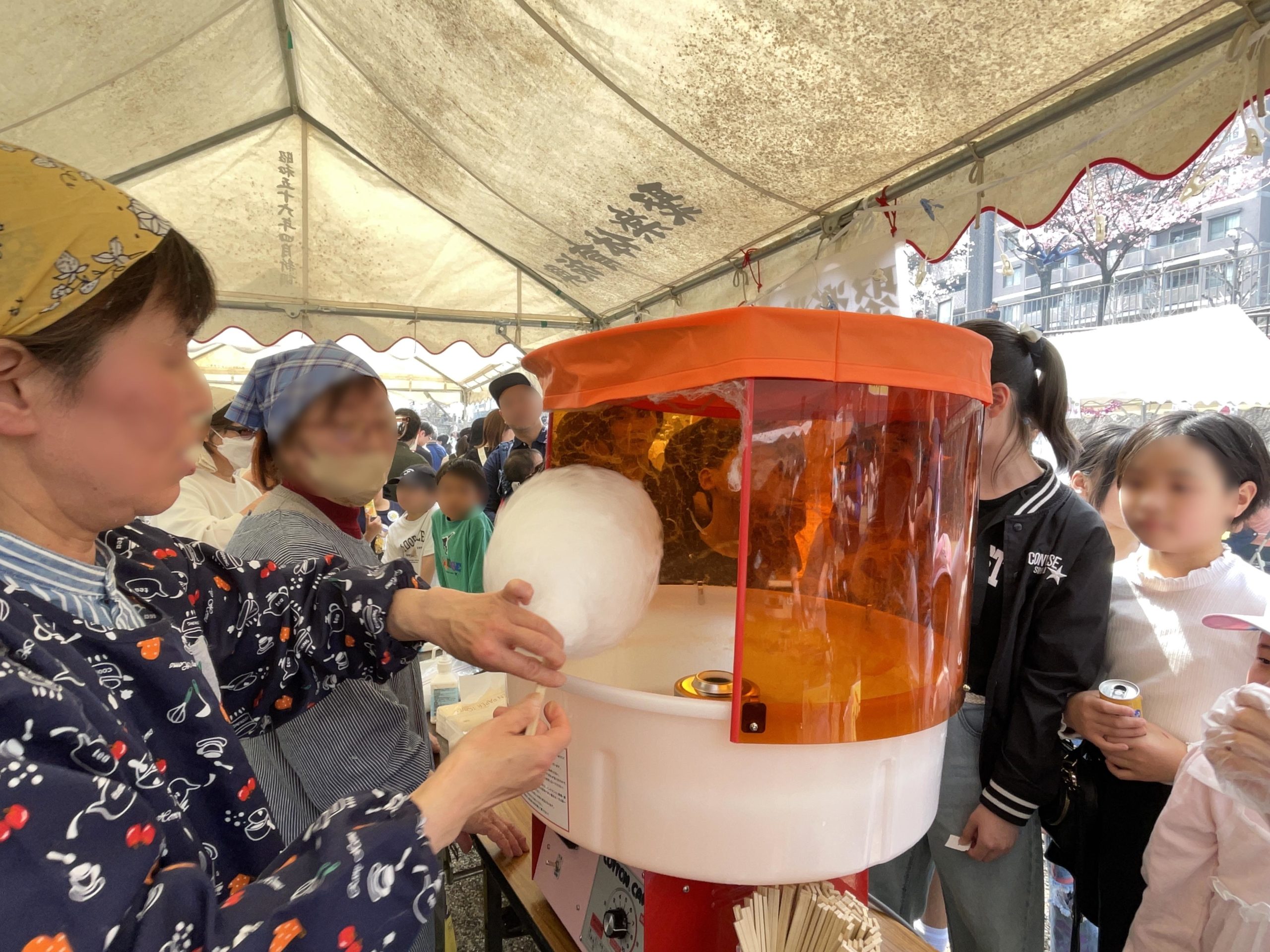 10時から式典、市長さんの挨拶もありました。模擬店は式典の終わった10時半から開始。フライングで式典の最中から売っていた店もありましたが、うちはちゃんと規則を守りました。桜まつりの終了は15時。最後まで店開きしていると片付ける時間も無いので、20分ぐらい早めに「完売」の札を出して閉店させましたが、客足が途絶えることは全くありませんでした。ずっとお客さんが並んでくださっていて、用意していただいたお寿司を交代で食べた時間以外はずっとお店に出ていました。綿菓子作りは私ともう一人がほぼ担当。お砂糖を入れる係と綿菓子を作る係を2人で交代。綿菓子作りは手をずっと持ち上げてながらお箸をクルクル回しているので、結構疲れるのです。それにほとんど立ちっぱなしでしたから、ホント、疲れた。でも楽しかった。