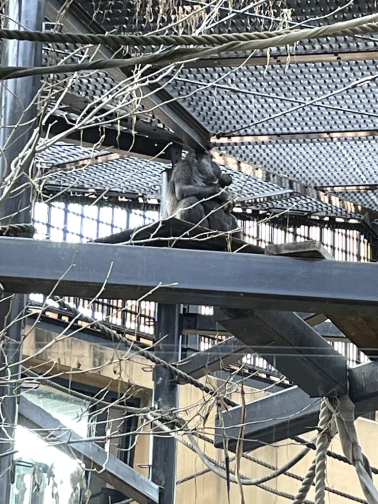 演奏が終わってから、少し動物園内を散策。11月に生まれたゴリラの赤ちゃん、サンタロウには是非とも会いたかったので、まずはゴリラの家に。高い所でお母さんのゲンキに抱かれていたので少し見にくいですが。