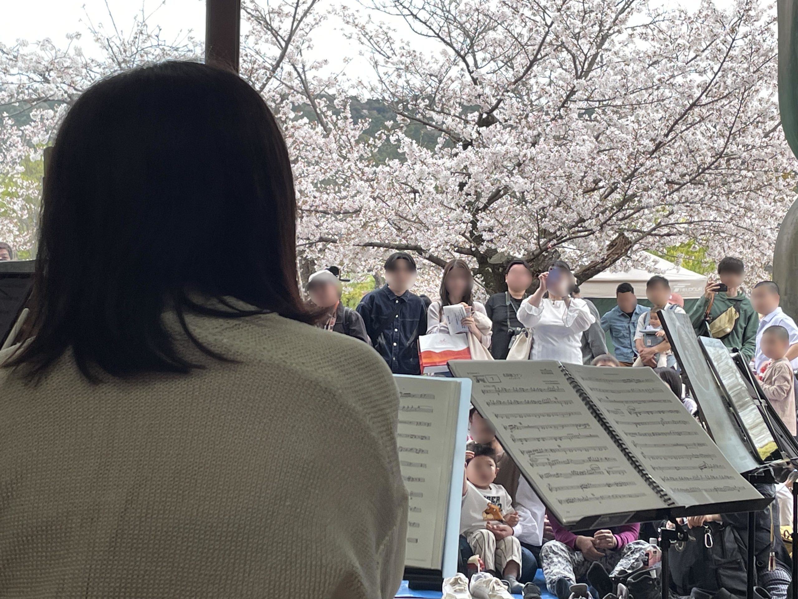 動物園内も桜が満開。入り口近くの芝生広場はまさにお花見の雰囲気。そのすぐ正面の室内で演奏させていただき、お客様は外の桜を背に聴いてくださいました。演奏者から見ると、お花見しながらお客様を眺めている感じ。